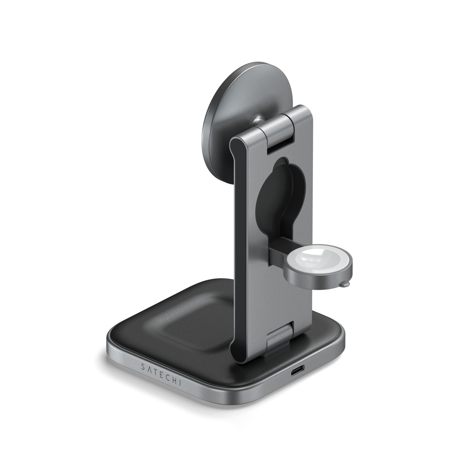 The foldable design and adjustable hinges make the stand highly portable and convenient for travel. It includes its own USB-C PD 45W power adapter and cable for added convenience, plus four international plugs – US, EU, AU, and UK – so you can quickly and conveniently charge your devices wherever you go. Its foldable arm is made of sleek recycled aluminum, while the AirPods charging pad at its base is crafted from black vegan leather. The top hinge allows you to effortlessly adjust your device on the stand, while the bottom hinge enables it to fold for ultimate portability. The watch component is retractable and can easily snap upright to minimize space when not in use.